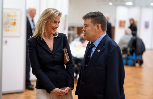 Dressed in an elegant black blazer and white skirt, Sophie, 61, quickly got stuck in as she toured the gallery and met the incredible artists who have all overcome huge adversity and now create their work using just their mouths and feet to hold their paintbrush.